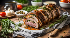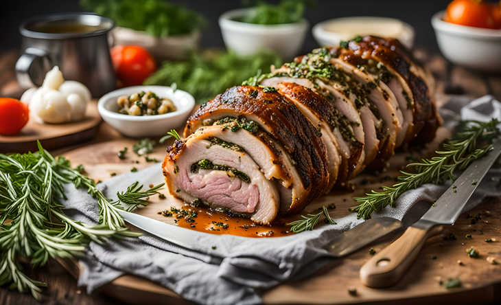 Main Course – Slow Cooked Summer Barbecue Porchetta, Crispy Crackling, Roasted Garden Harvest Vegetables, Caramelised Orchard Apples, Lemon & Caper Gremolata
