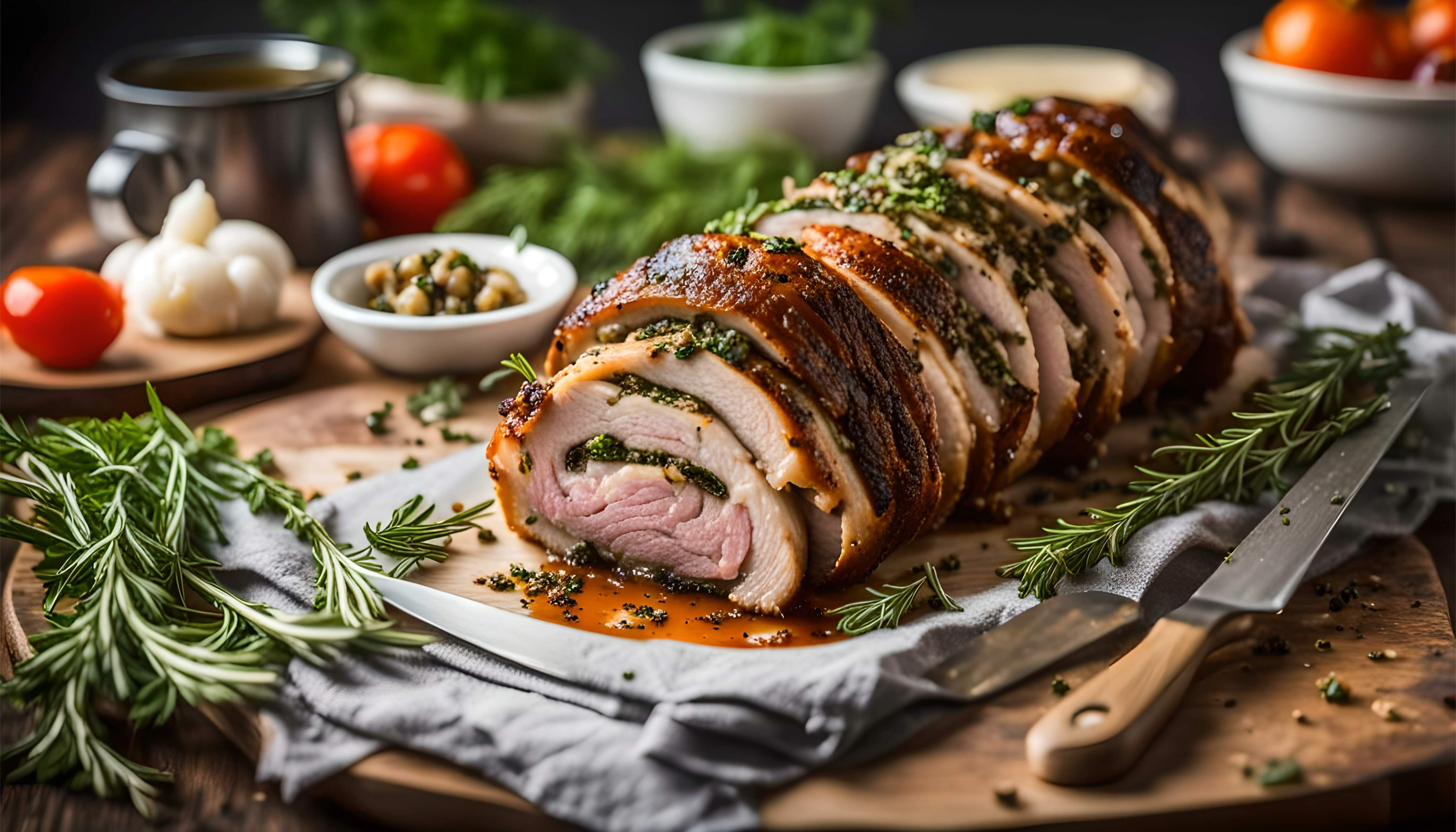 Main Course – Slow Cooked Summer Barbecue Porchetta, Crispy Crackling, Roasted Garden Harvest Vegetables, Caramelised Orchard Apples, Lemon & Caper Gremolata